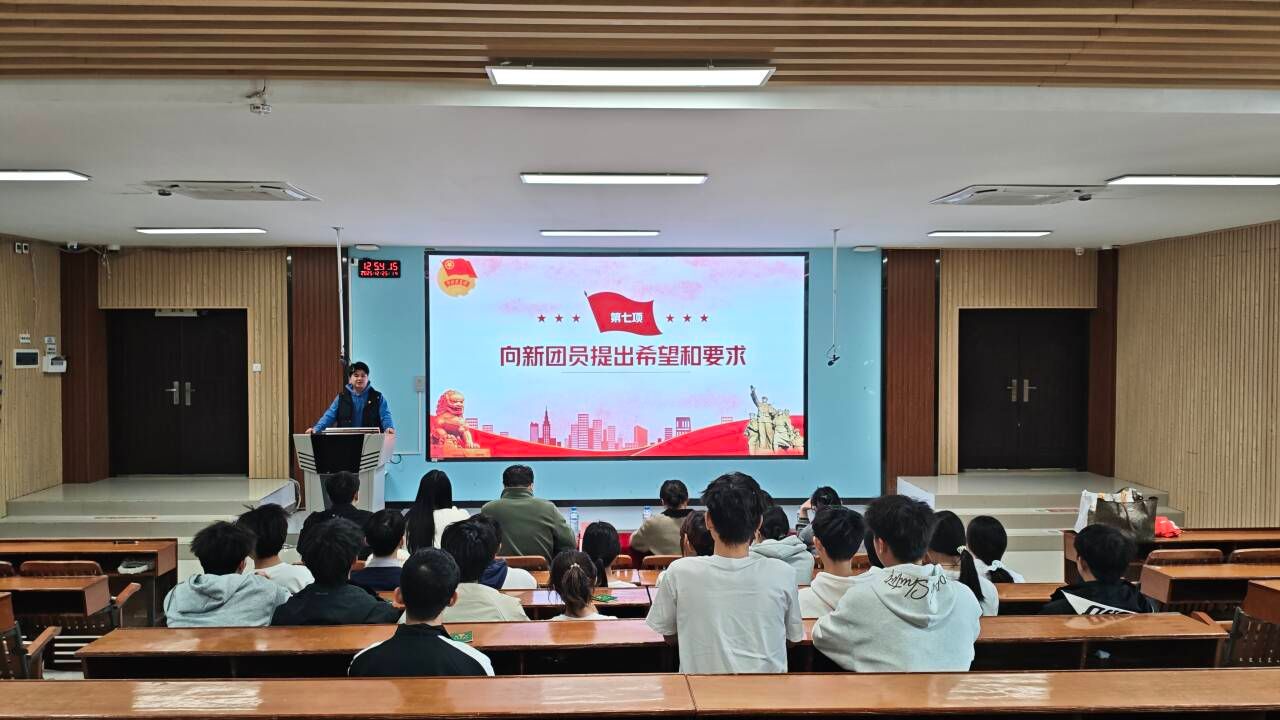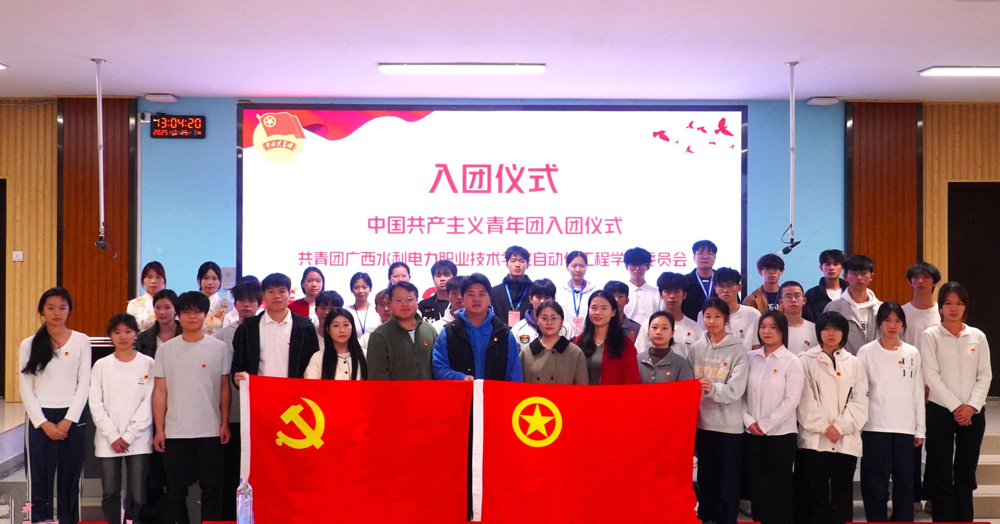 【本网讯】为加强团组织建设,传承共青团精神,激励青年学子坚定理想信念,2025年12月25日,共青团广西水利电力职业技术学院自动化工程学院委员会在阶梯202教室隆重举行新团员入团仪式。自动化工程学院团委书记温和锋、专职组织员覃黄兆、学生党支部书记尹伊美及辅导员陈倩、黄友清、周永恒、韦纪君出席仪式,全体新团员及老团员代表参加仪式。