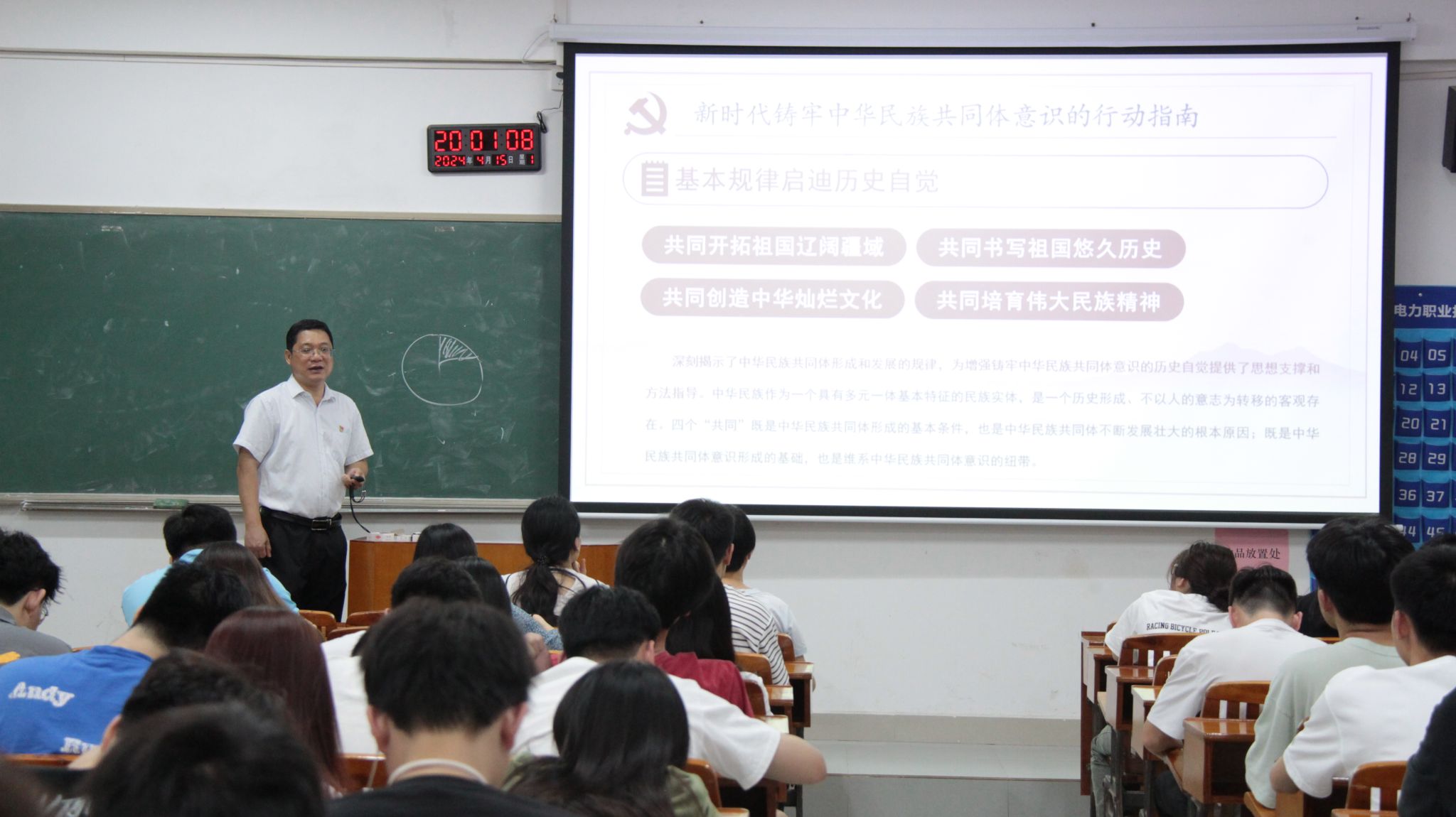 石庆华老师着重强调了民族团结的重要性,他指出,民族团结不仅是社会稳定和发展的有力保障,更是实现中华民族伟大复兴的坚实基石。他深入浅出地阐释了铸牢中华民族共同体意识的重大意义,明确其对于维护国家统一与促进民族团结的关键作用。他通过丰富的实际案例,以生动形象的方式展示了民族团结的深远影响和中华民族共同体意识的丰富内涵。同时,鼓励团委学生会成员充分发挥带头作用,在日常学习和生活中积极倡导和践行民族团结,为构建和谐美好的校园环境、推动社会和谐发展贡献自己的力量。