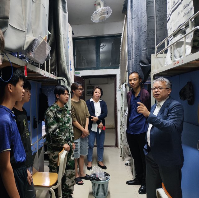 走访过程中,蒋副校长一行与同学们聊生活、问冷暖、谈学习、做规划。蒋副校长询问2023级新生近期军训情况,听取学生们未来三年的学业规划,并耐心给他们提出规划建议;韦素娟副处长和罗宇强书记叮嘱同学们要注意人身财产安全,调整好状态,合理作息,以饱满的热情投入到学习生活中去。