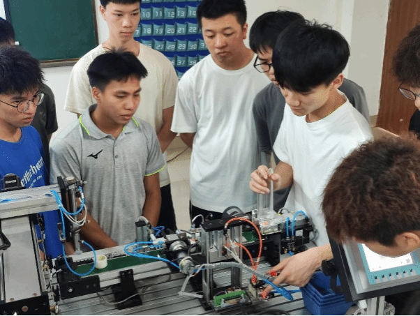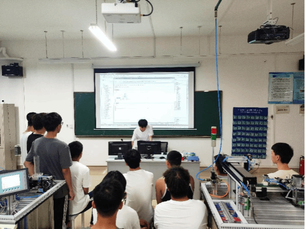 本次活动在郭平、杨振华老师的指导下,由参赛经验丰富的学长向学弟们作知识分享。学长先详细讲解生产线实训装置的结构并现场演示,紧接着分享了自己的编程技巧和竞赛经验。同时组织了编程实践和答疑,使学弟们更好地理解编程技巧和竞赛要求,对技能大赛有了更深入的了解。